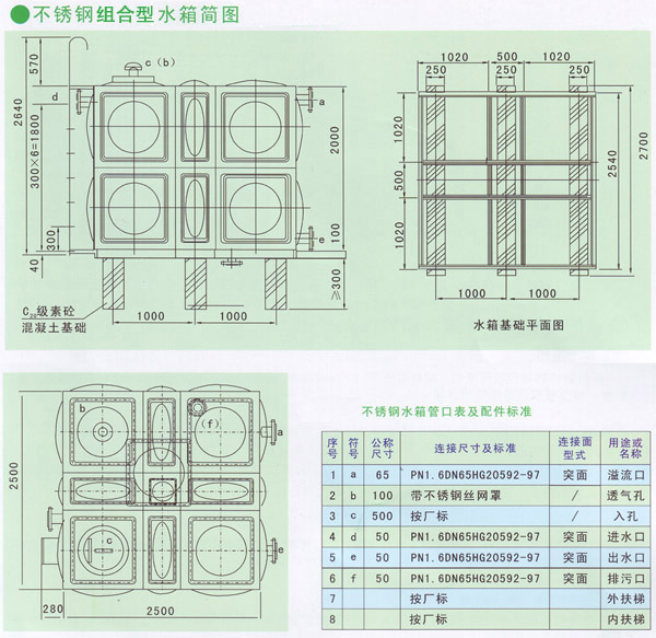 1、產品可根據用戶需求,從0.5m3~2000m3任意組合。水箱的有效容量按高度-230mm計算。